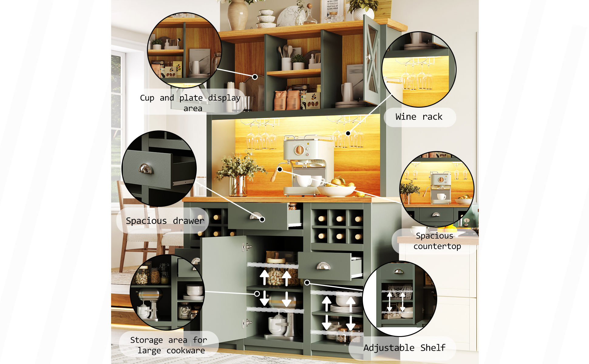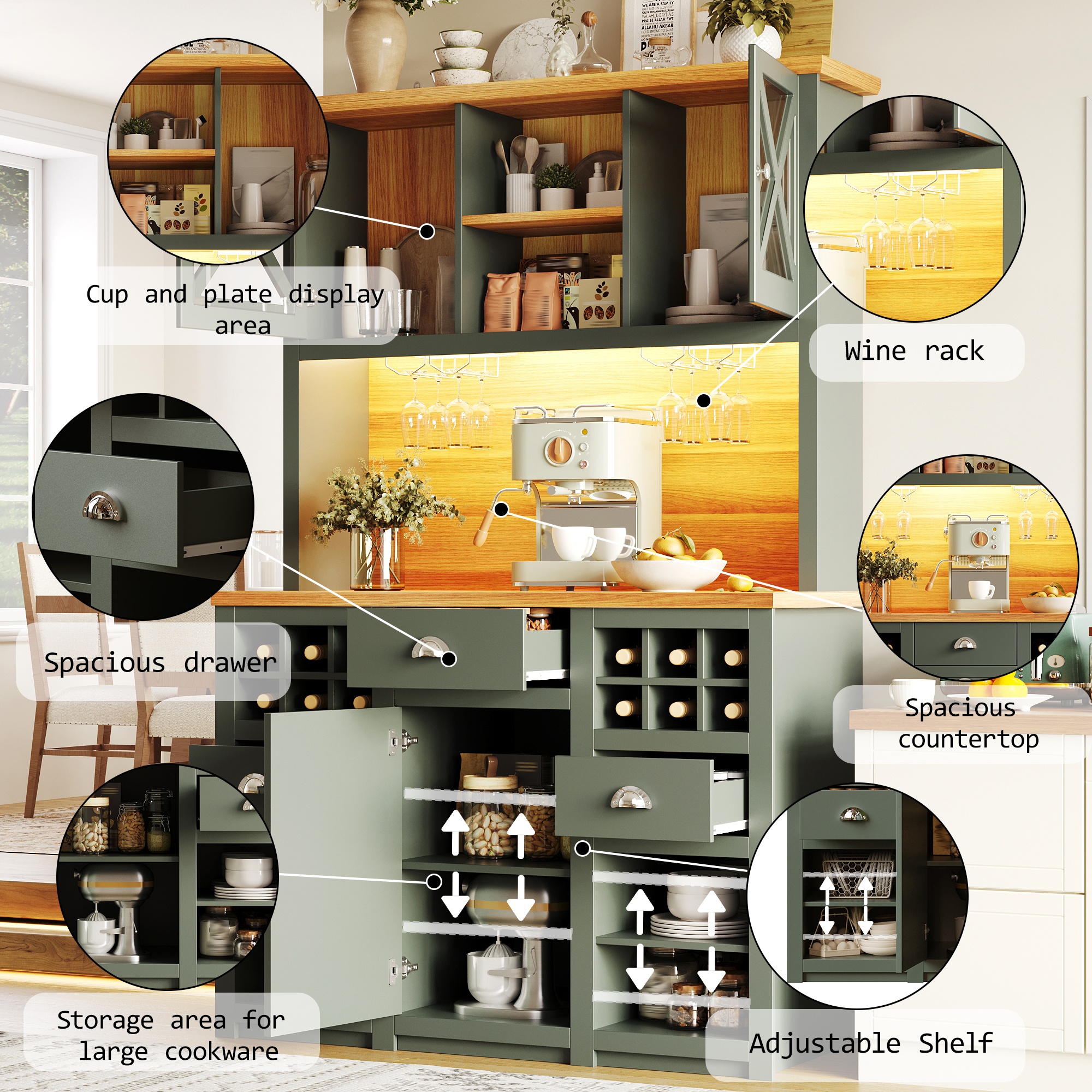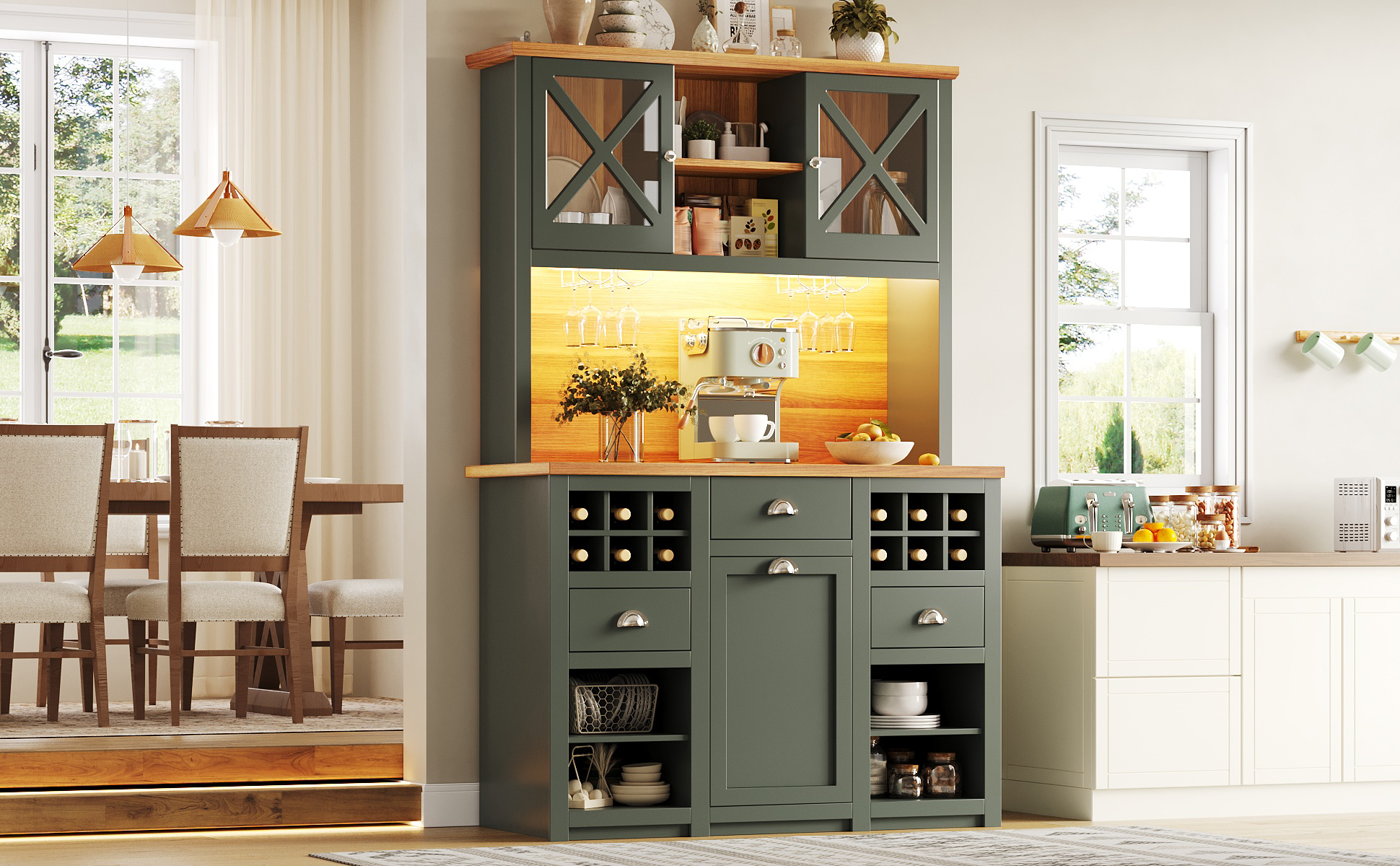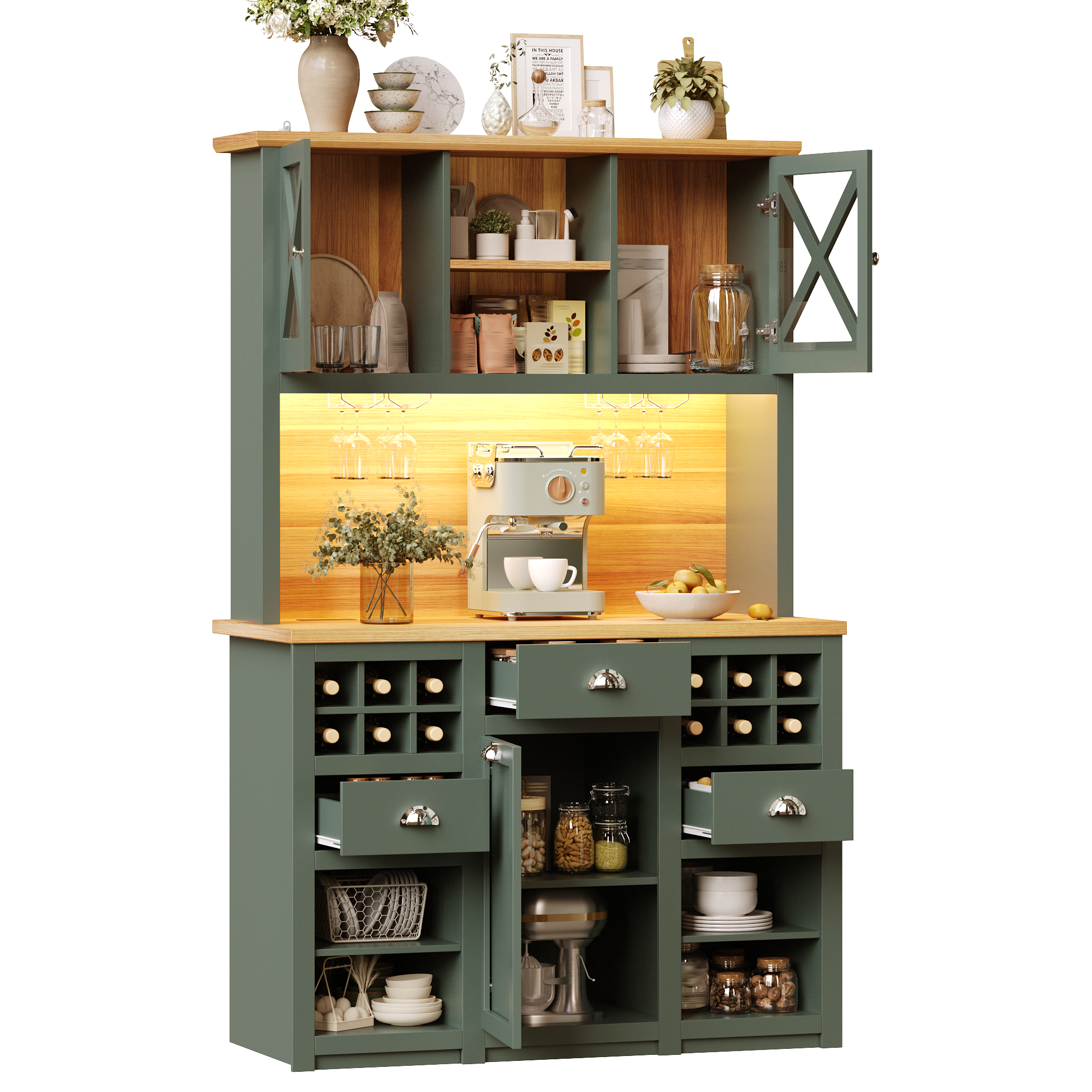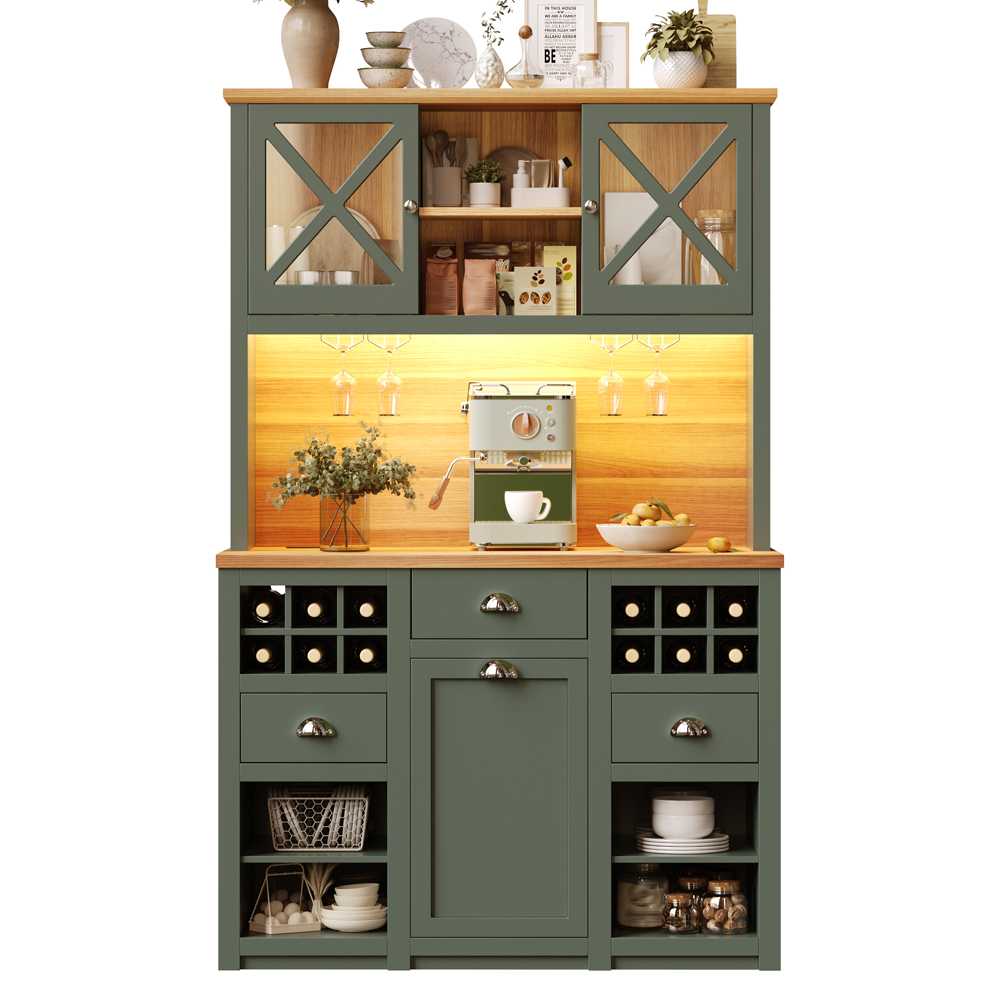 Kitchen Cabinets , Tall Kitchen Cabinets, Sideboards, Kitchen Cabinets With Glass Doors And LED Lighting, Side Cabinet With Wine Rack, Adjustable Shelves, Green