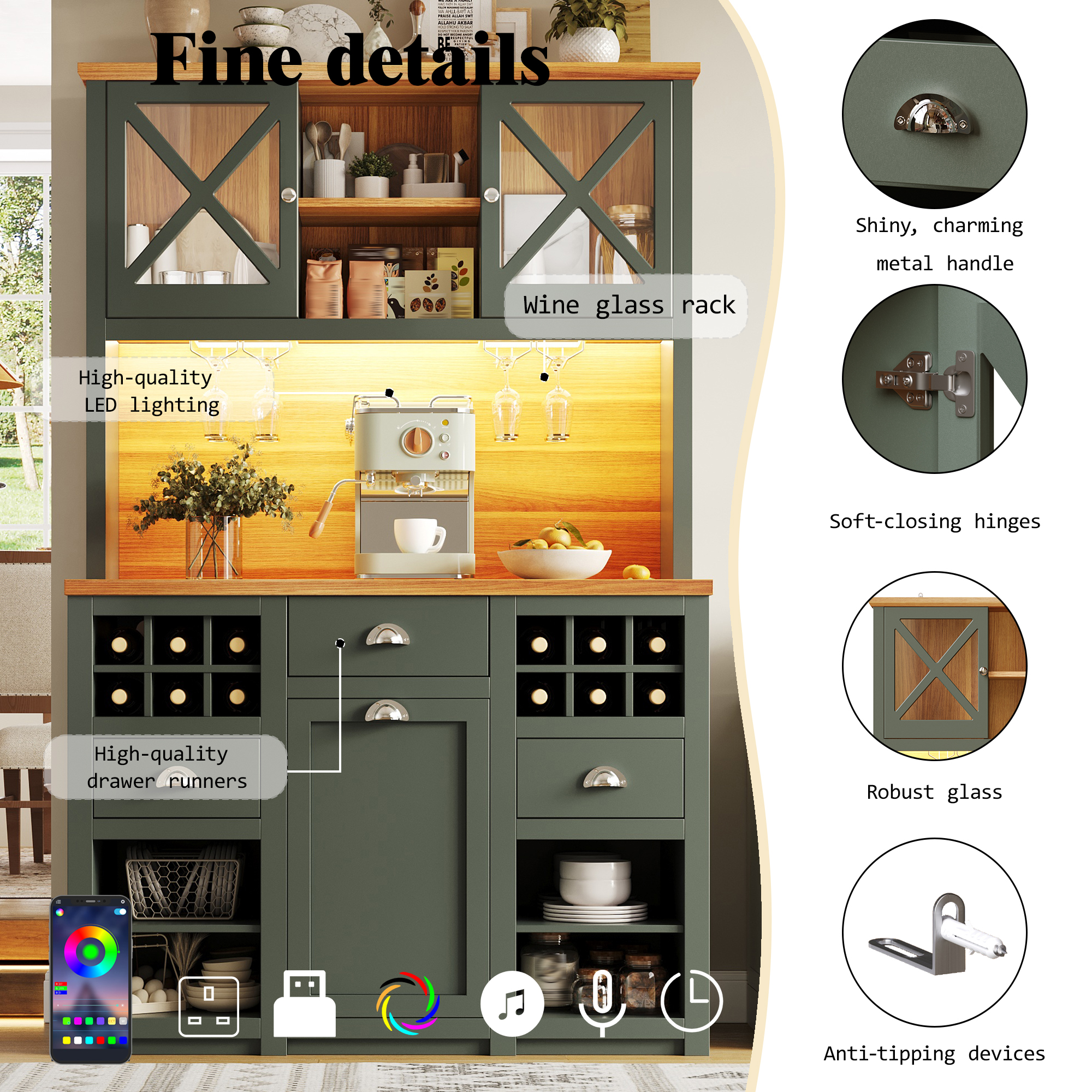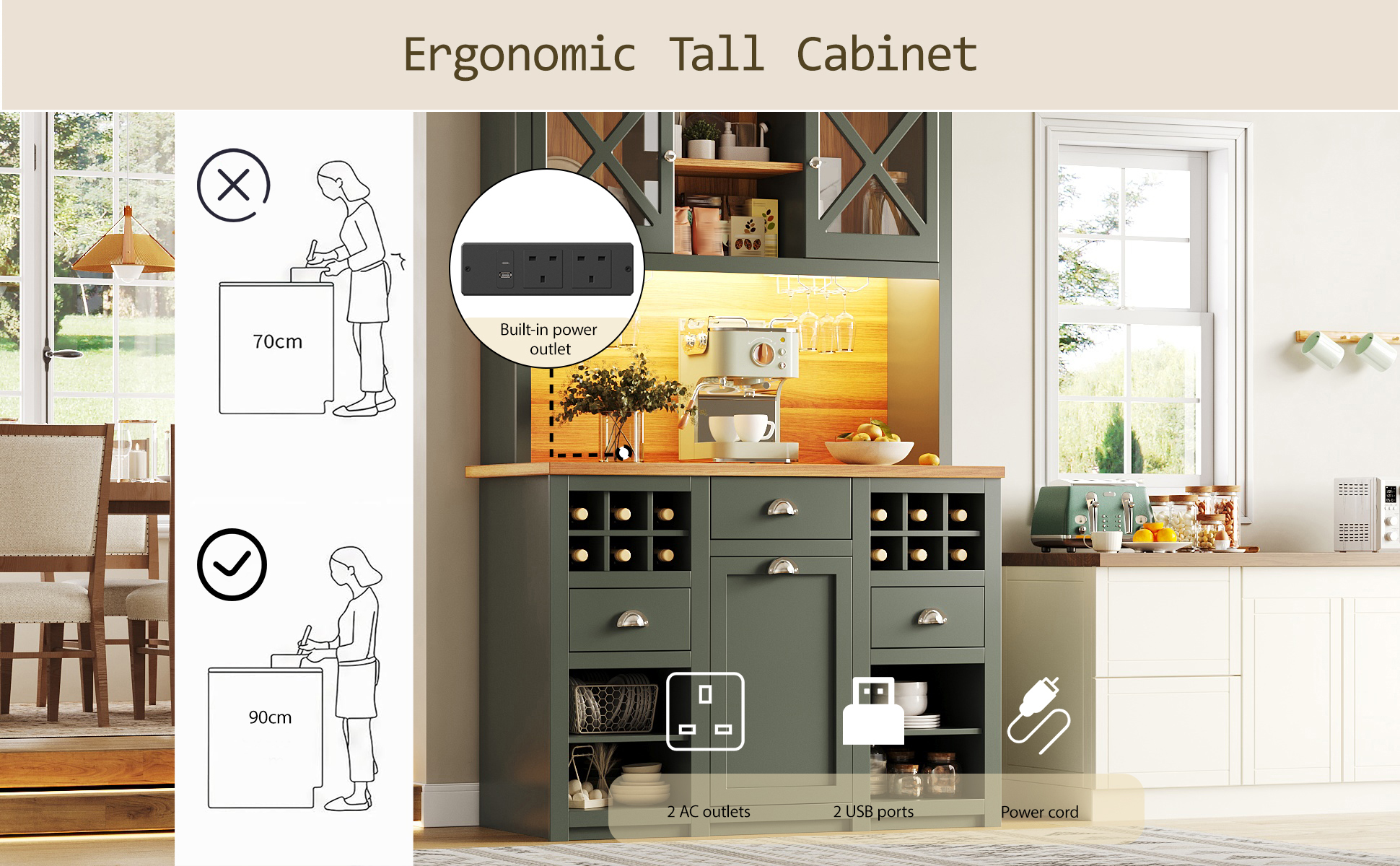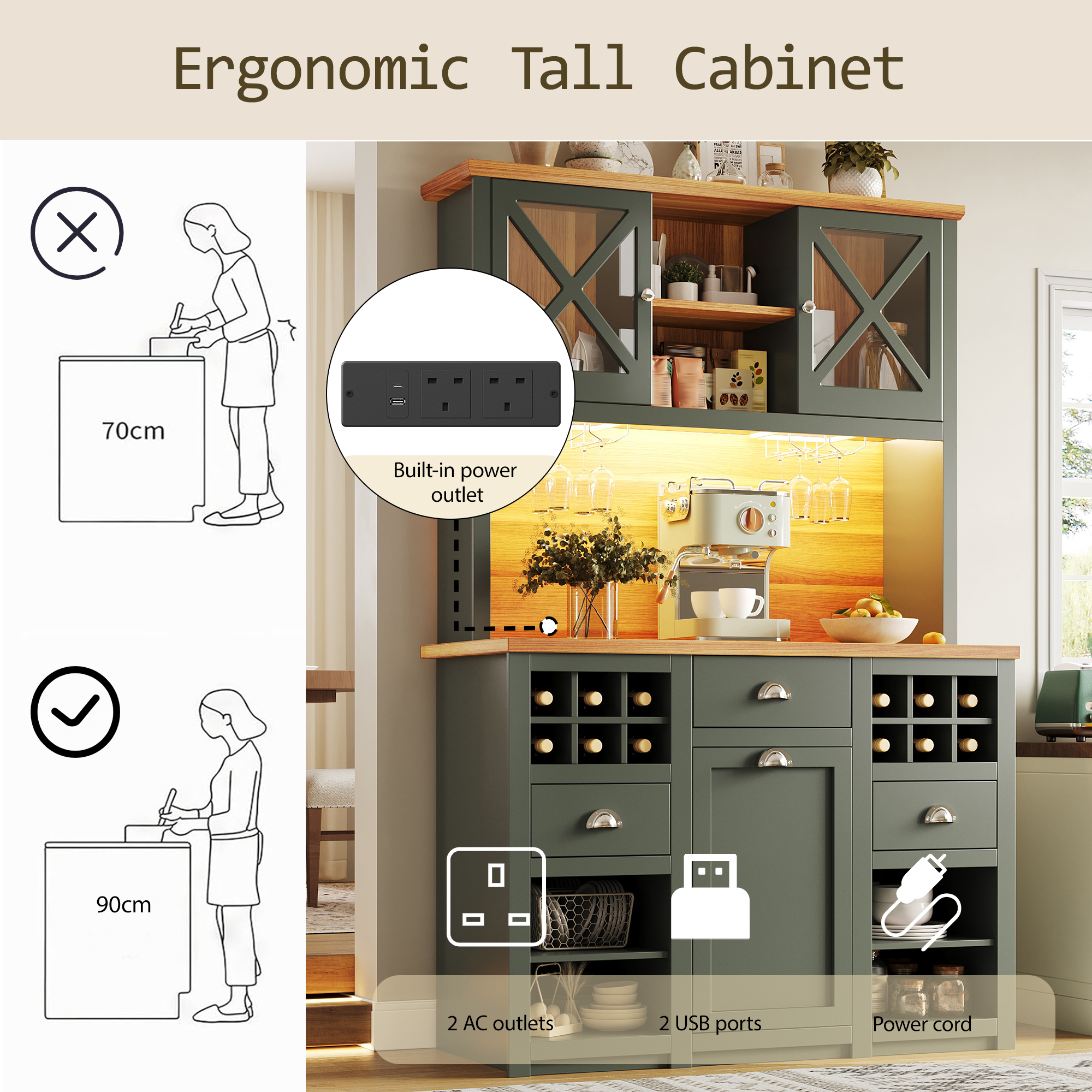 This ergonomically designed tall cabinet offers ample storage space for large cookware, tableware, wine glasses, and more. Adjustable shelves inside flexibly adapt to different storage needs. A specially designed display area for cups and plates and a wine rack keep items organized. It also features two AC outlets and two USB ports for easy connection to kitchen appliances or charging mobile devices, combining aesthetics and practicality.
