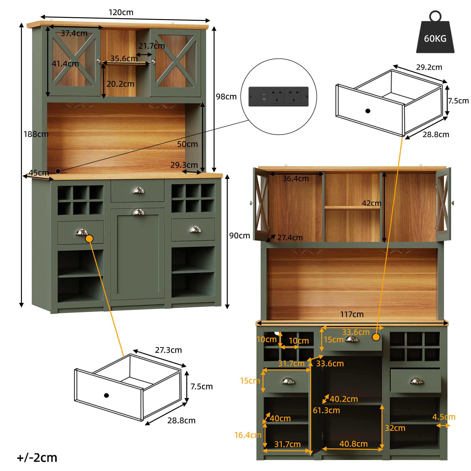 - Integrated Power Interfaces: Equipped with two AC power outlets and two USB ports, allowing direct connection to kitchen appliances or charging of mobile devices. Modern and practical, enhancing kitchen convenience.