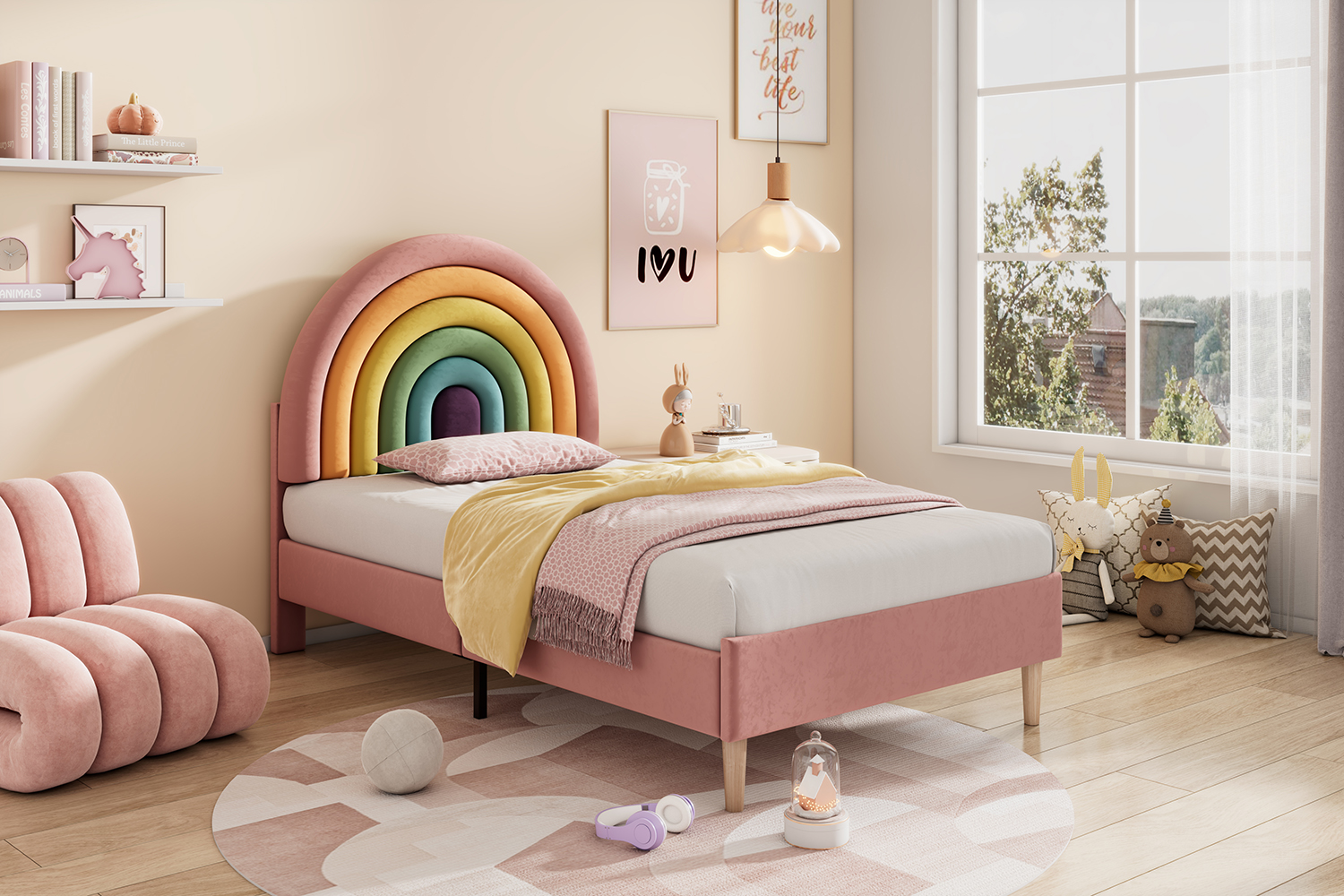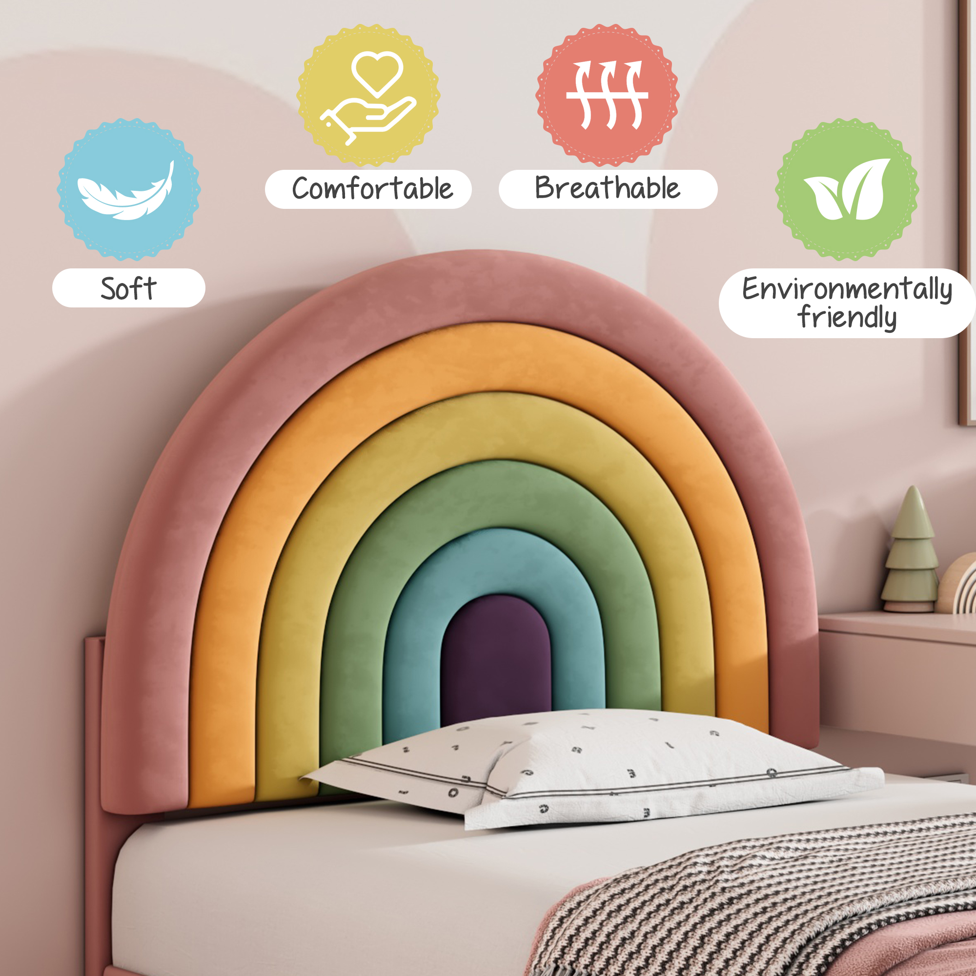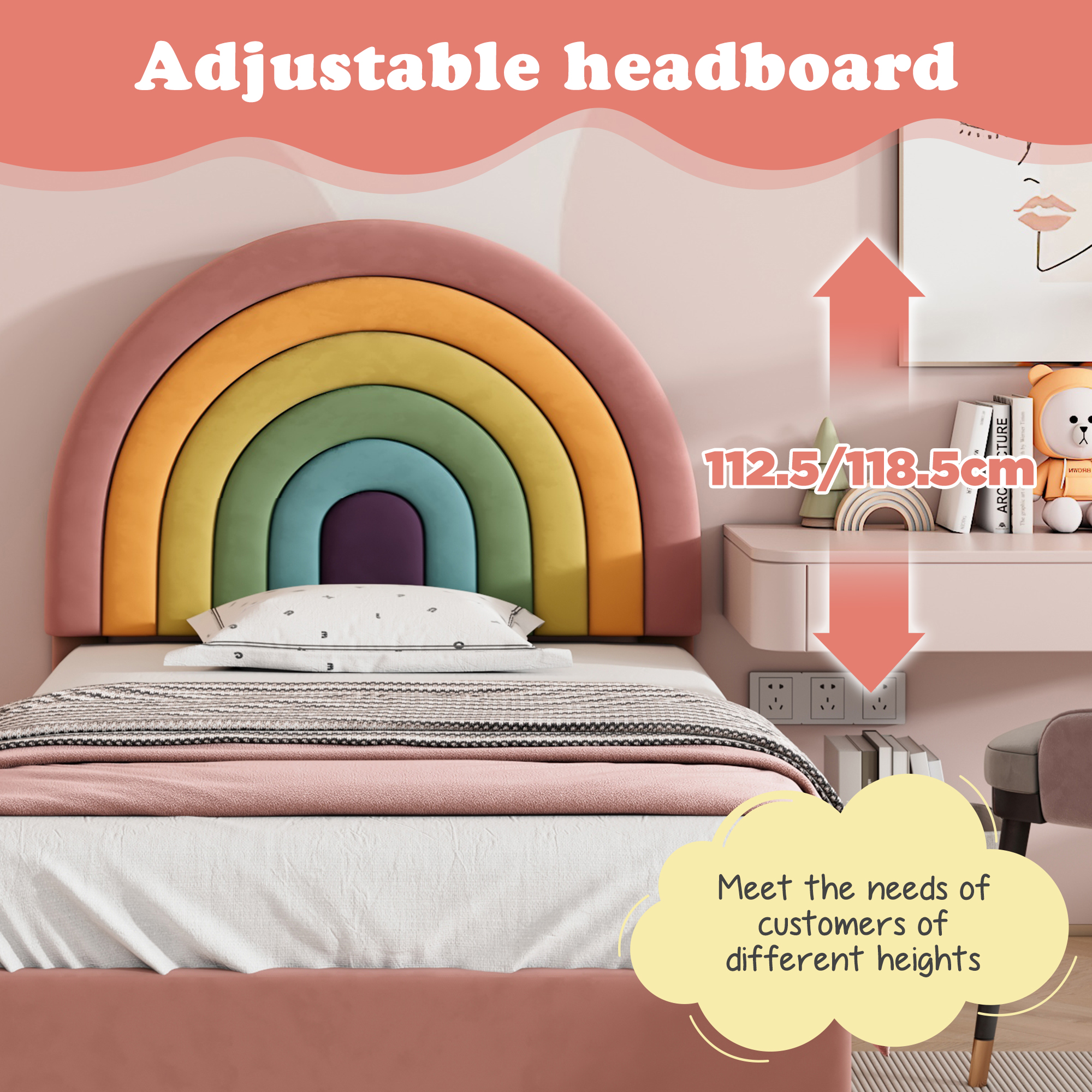 • Timeless design: The upholstered bed has a classic and at the same time modern design thanks to its upholstered look; The bed fits most interior styles; The bed makes even small rooms feel open and spacious. The rainbow headboard design makes this bed even more unique.